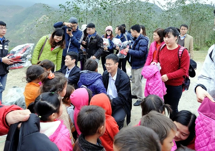 Tận tay mặc những chiếc áo ấm cho các học sinh trong lần thiện nguyện của trường ở Hà Giang.