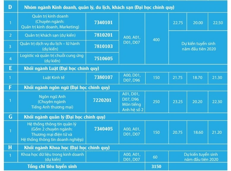 Theo đó, trường dự kiến sẽ tuyển 3.150 chỉ tiêu theo hai phương thức tuyển sinh. Thứ nhất là xét tuyển dựa trên kết quả điểm thi của thí sinh trong kỳ thi THPT Quốc gia năm 2020, chỉ tiêu phân bổ dự kiến 85%.
