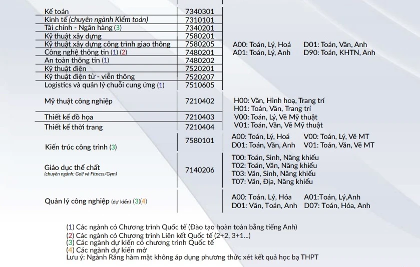 Thông tin tuyển sinh từng ngành như sau: