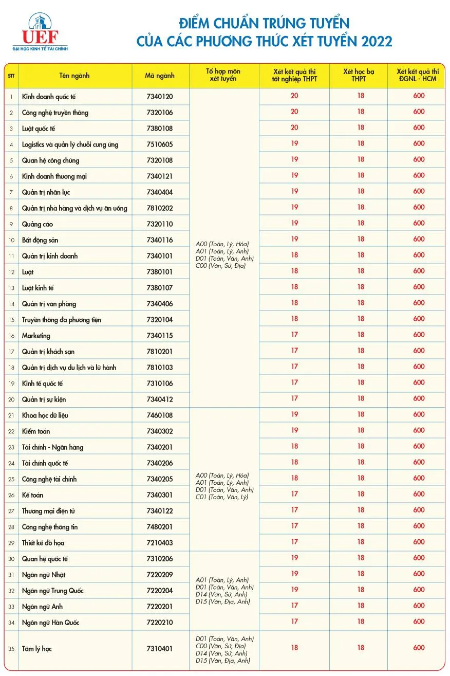 Tương tự, theo công bố của Trường ĐH Kinh tế Tài chính TP.HCM, điểm chuẩn trúng tuyển theo phương thức xét kết quả tốt nghiệp THPT cao nhất là 20, gồm các ngành là ngành Công nghệ truyền thông, Kinh doanh quốc tế, Luật quốc tế.