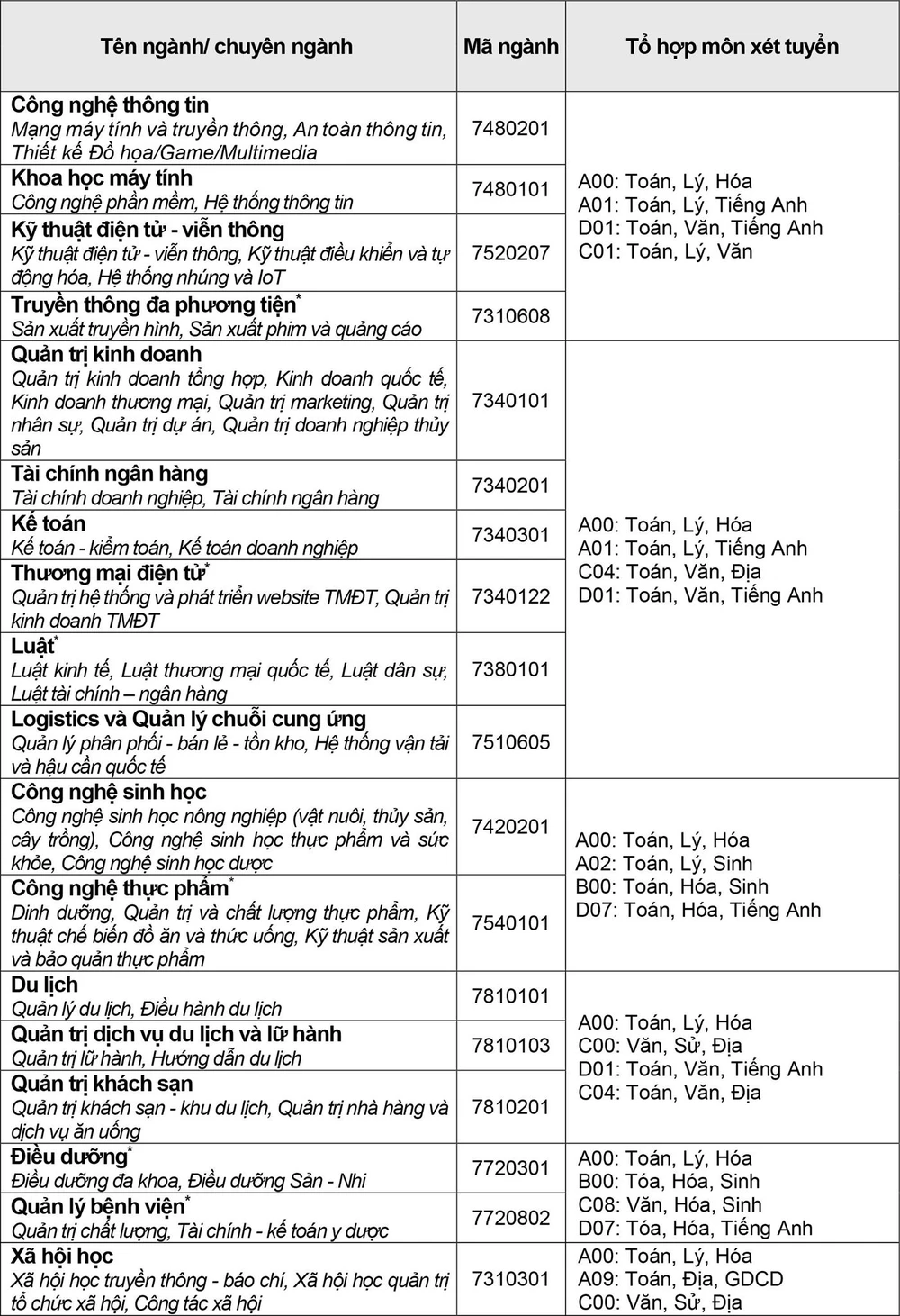 Thông tin tuyển sinh các ngành cụ thể như sau: