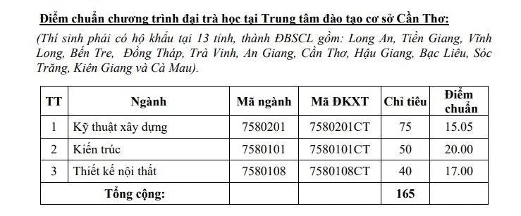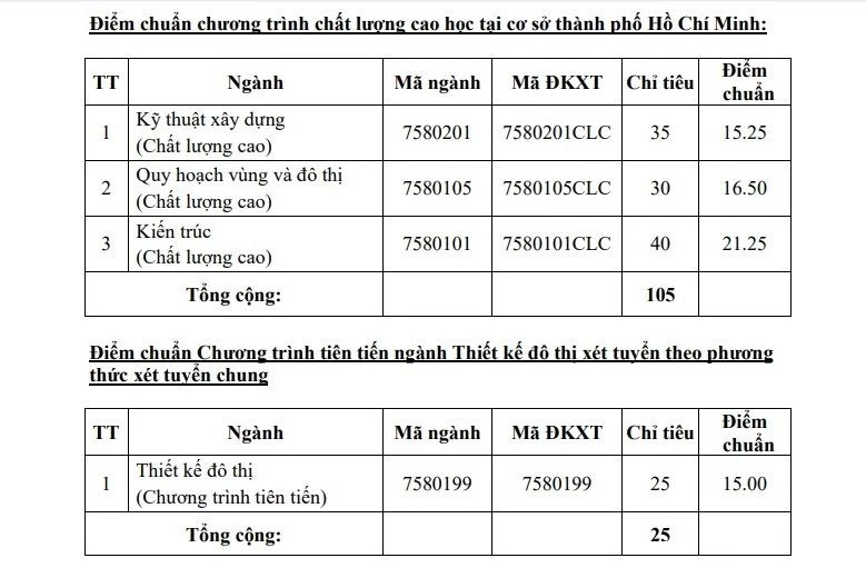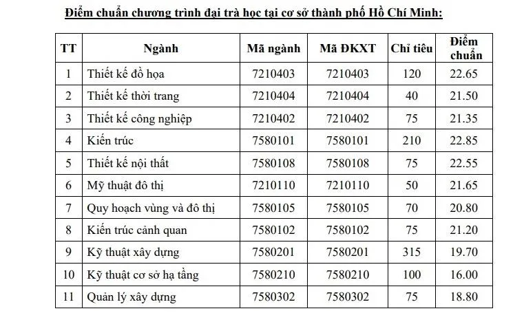 Còn với Trường ĐH Kiến trúc TP.HCM, điểm chuẩn cũng dao động từ 15 đến 22,85 điểm. Ngành cao điểm nhất là Kiến trúc, kế đến là thiết kế đồ họa với 22,65 điểm, thiết kế nội thất là 22,55. Một số ngành khác như Mỹ thuật đô thị, thiết kế công nghiệp, thiết kế thời trang, Kiến trúc (chất lượng cao) cũng trên 21 điểm.