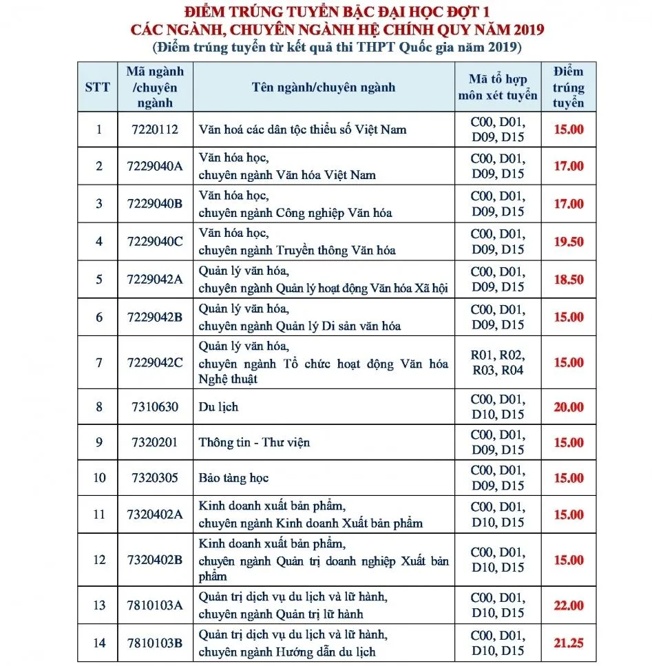 Theo công bố của Trường ĐH Văn hóa, mức điểm thấp nhất là 15 điểm và có đến 7/14 ngành học của trường có mức điểm thấp này. Ngành cao nhất với 22 điểm là Quản trị dịch vụ du lịch và lữ hành (chuyên ngành quản trị lữ hành).