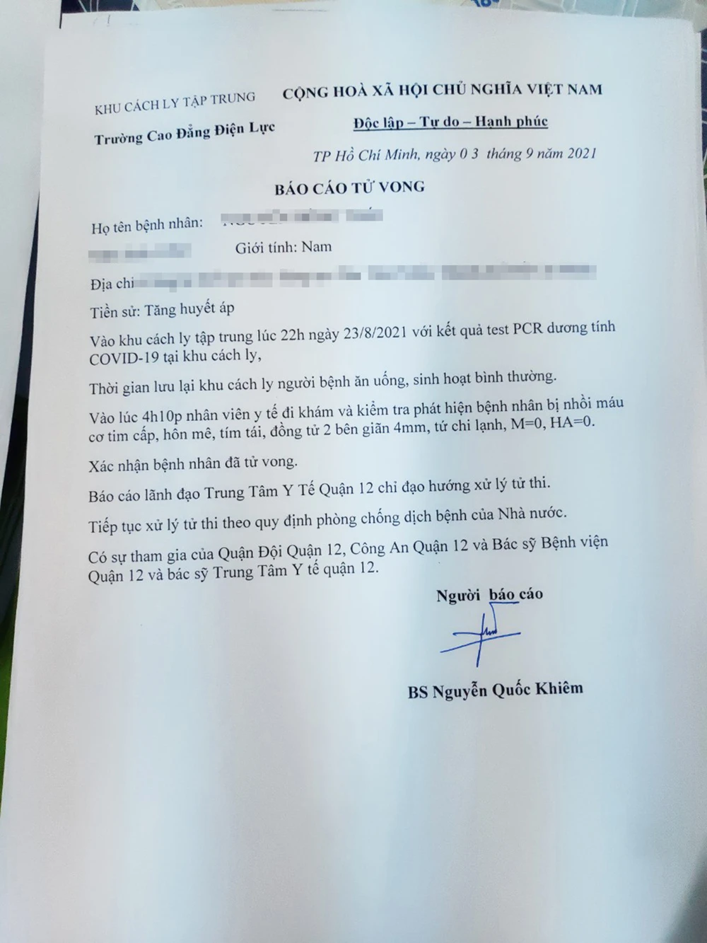 Báo cáo tử vong mà Khiêm ký. Ảnh: PV