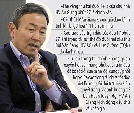 Có mặt trên sân Long Xuyên theo dõi trận HV An Giang - Than Quảng Ninh và chứng kiến toàn bộ trận đấu lẫn cảnh trọng tài Phùng Đình Dũng bị hành hung, trưởng giải Koji Tanaka đã công tâm nhận xét về những điểm nhấn mà trọng tài Dũng làm nhiệm vụ.