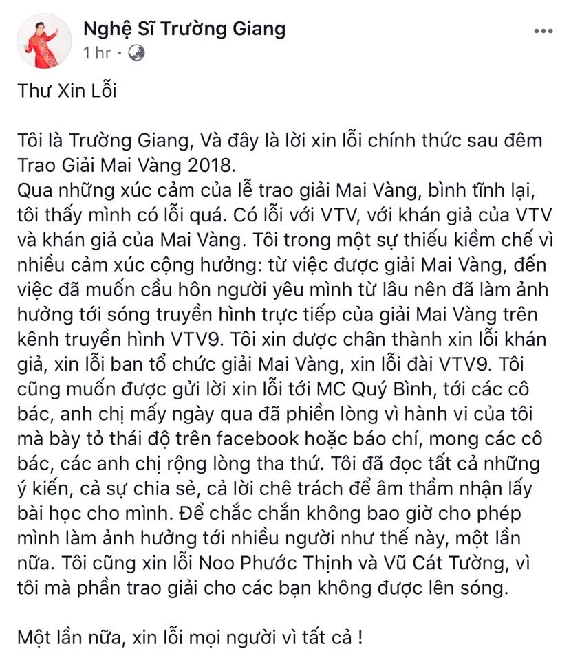Tôi là Trường Giang, Và đây là lời xin lỗi chính thức sau đêm Trao Giải Mai Vàng 2018.