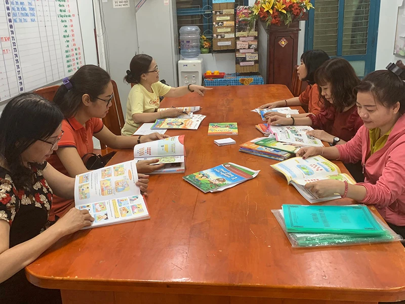 Giáo viên Trường Tiểu học Nguyễn Thị Minh Khai, quận Gò Vấp nghiên cứu các bộ SGK lớp 1 mới. Ảnh: NTCC