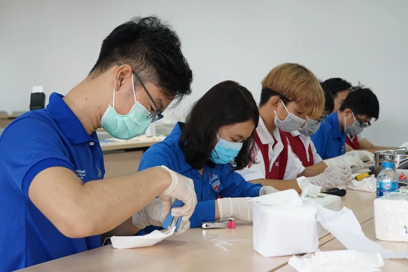 Các sinh viên cũng tích cực tự làm khẩu trang y tế để sử dụng trong trường.