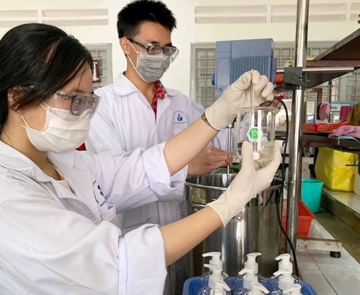 Nhóm thầy cô giáo thuộc Viện Môi trường (ngành Kỹ thuật công nghệ hóa học) của Trường ĐH Hàng hải Việt Nam đã chủ động điều chế khoảng 20.000 chai nước rửa tay khô để phát miễn phí cho toàn bộ cán bộ, sinh viên nhà trường.