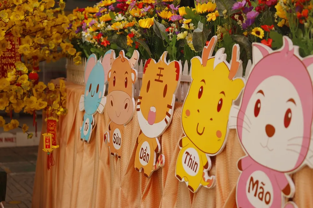 Hình vẽ mười hai con giáp ngộ nghĩnh, đáng yêu cũng được trang trí trên sân khấu.