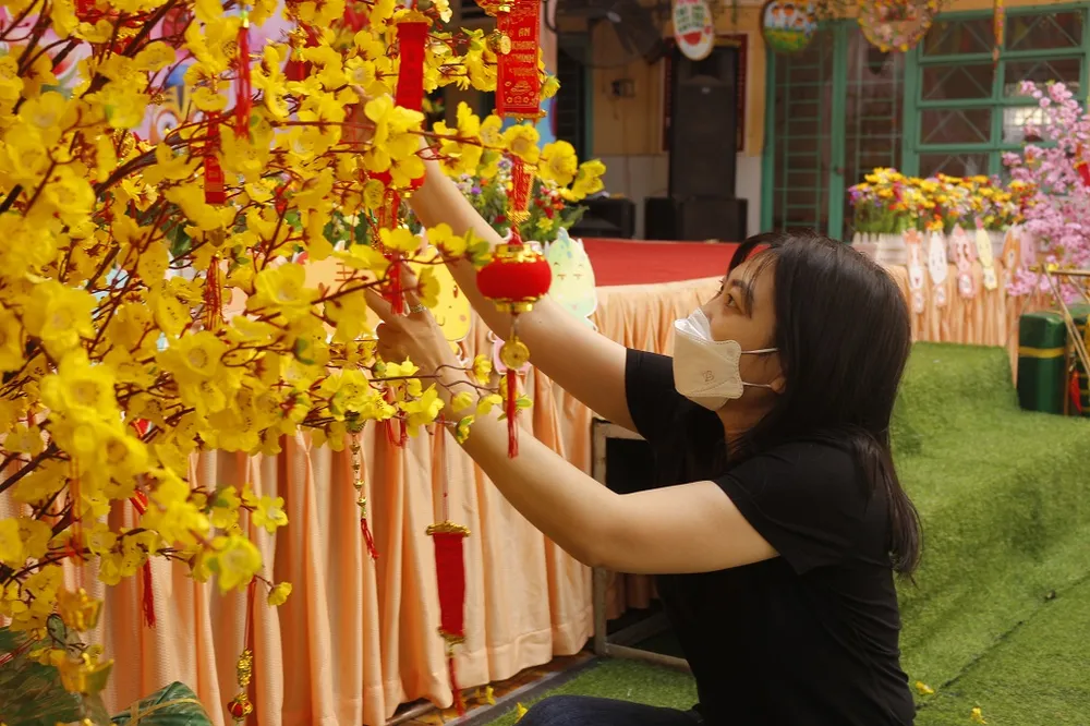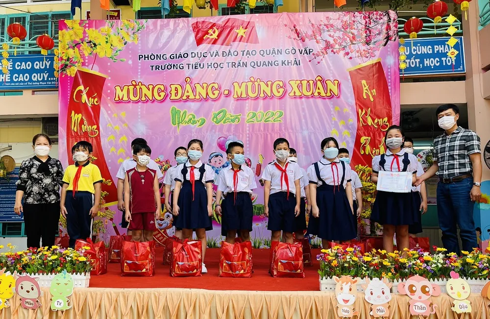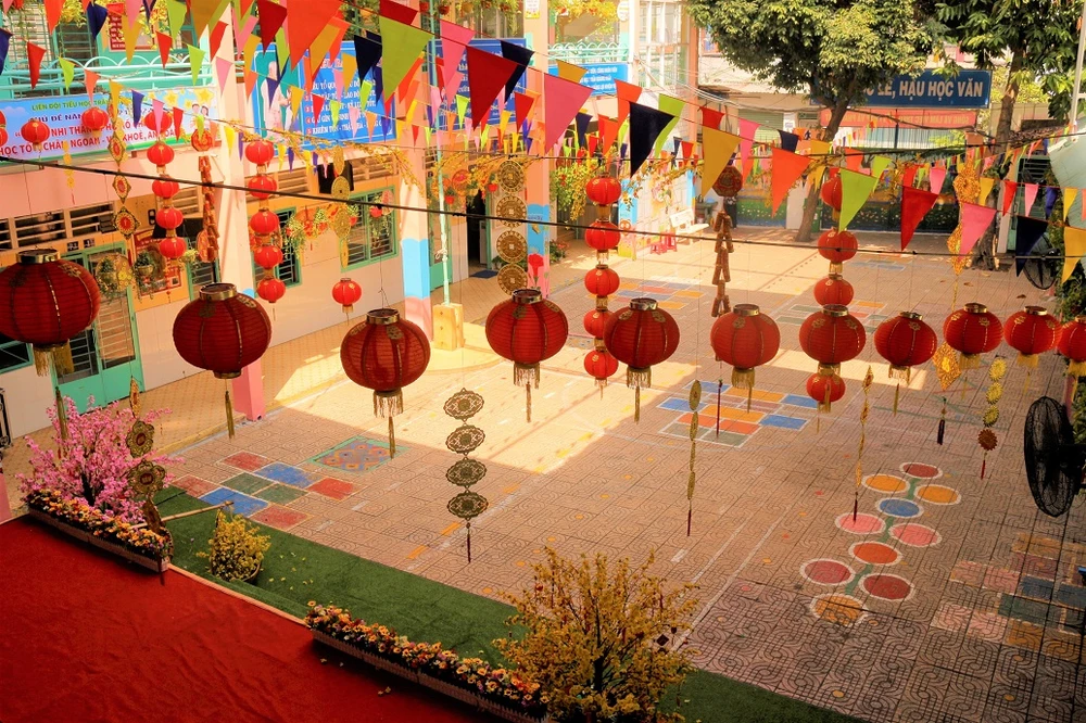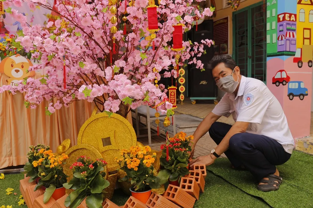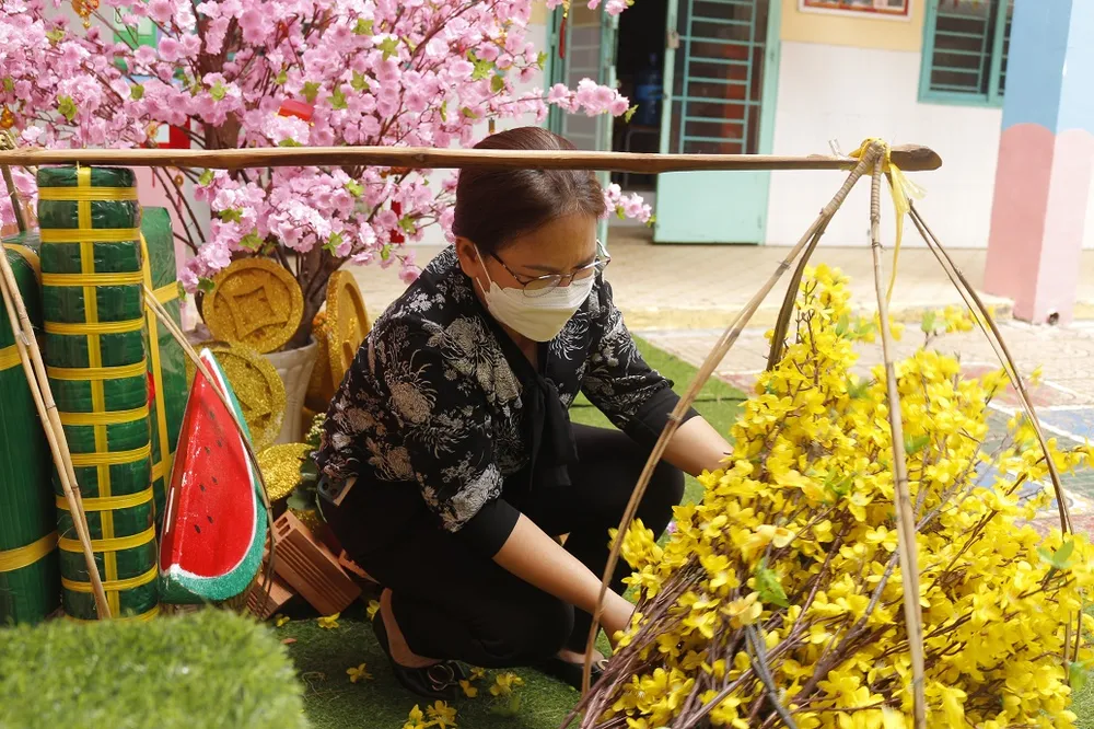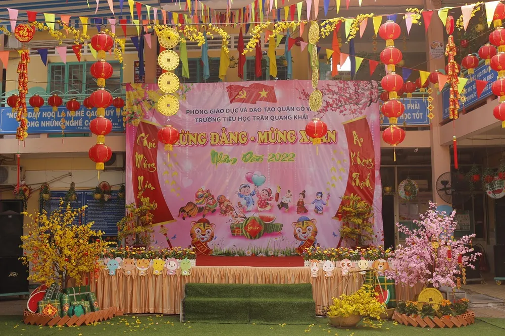 Hằng năm, cứ vào dịp gần Tết, thầy cô và bảo vệ trường Tiểu học Trần Quang Khải (quận Gò Vấp) lại tự tay trang trí khuôn viên trường. Người dựng sân khấu, người treo câu đối đỏ, lồng đèn, người sắp xếp chậu đào, chậu mai,... Bà Nguyễn Kim Phượng - hiệu trưởng nhà trường cũng tranh thủ dựng tiểu cảnh gánh mai, bánh chưng, bánh tét.