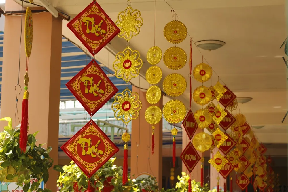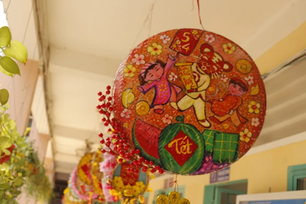 Câu đối đỏ, dây đồng tiền vàng treo trong khuôn viên trường ánh vàng cả khoảng không gian.