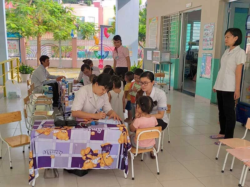 Phòng y tế Trường Mầm non 30/4, quận Bình Tân phối hợp với BV Bình Tân khám sức khỏe đầu năm cho học trò. Ảnh: TT