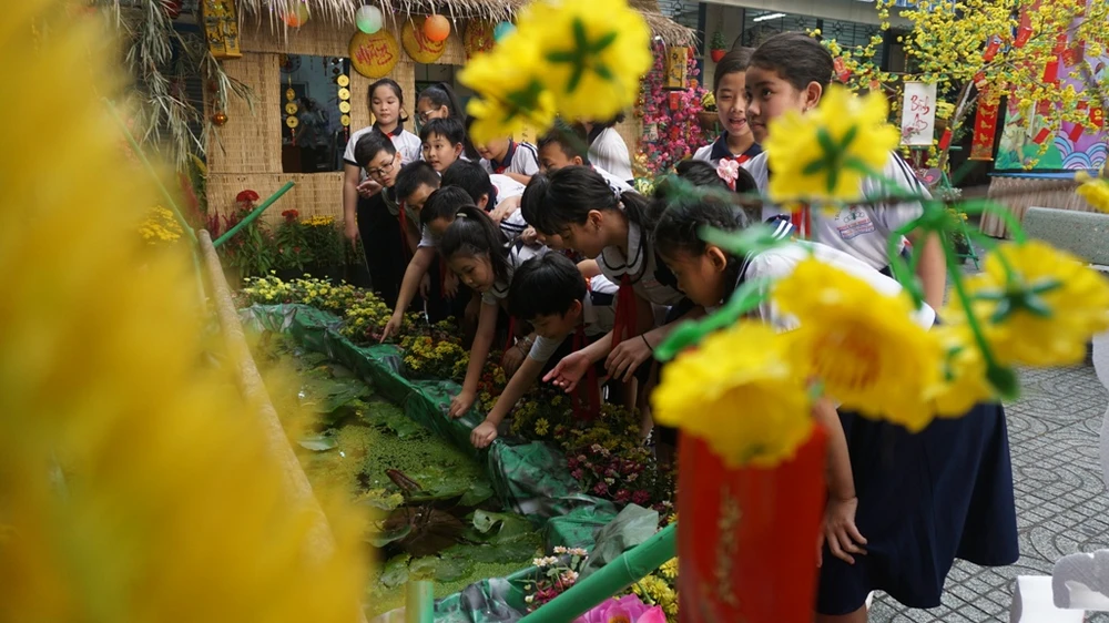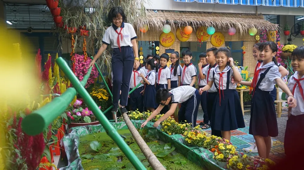 Tương tự, học sinh Trường THCS Nguyễn Du (quận 1) cũng được hòa mình vào không gian xuân với những tiểu cảnh trang trí mô phỏng tết Nguyên đán ở các vùng miền.