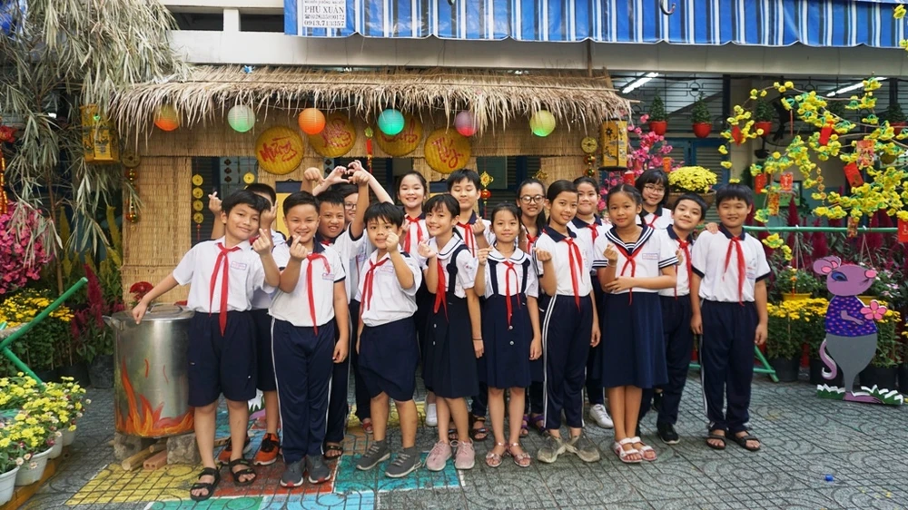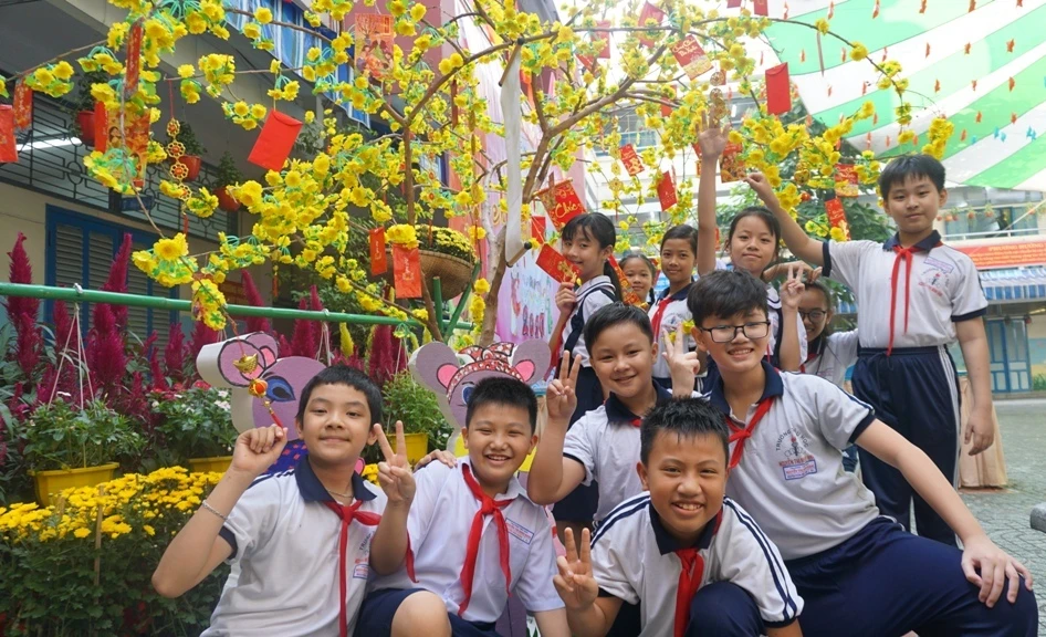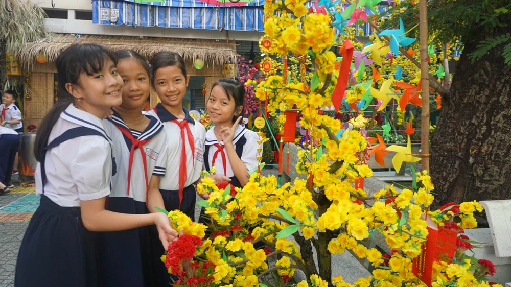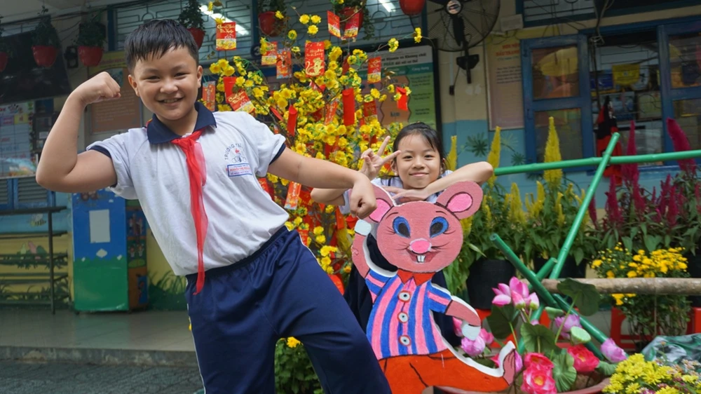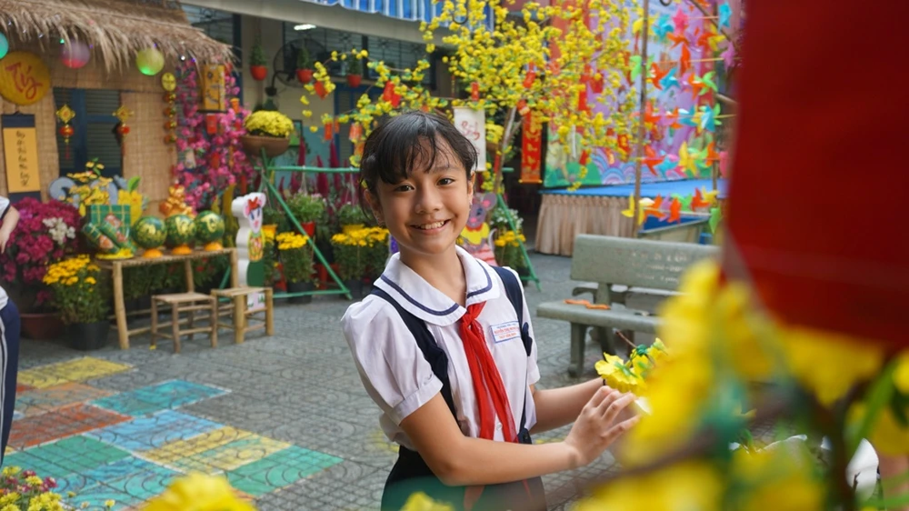 Tại Trường Tiểu học Nguyễn Thị Minh Khai (quận Gò Vấp), một khuôn viên nhỏ của trường đã được các thầy cô thiết kế thành một không gian mang đậm sắc xuân. Đó là mai vàng khoe sắc, điểm xuyết những bao lì xì đỏ rực cùng mô hình mâm ngũ quả ngày tết và những chú chuột dễ thương.