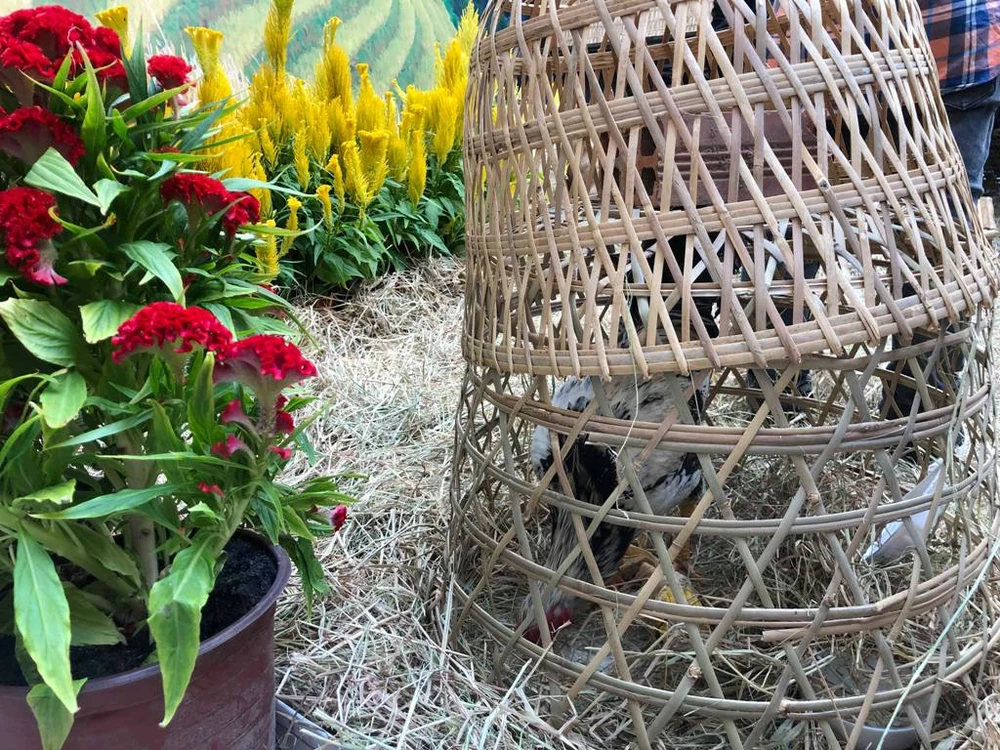 Học sinh bất ngờ khi trông thấy chú gà trống, rơm khô, hoa mào gà ngay giữa sân trường. Ảnh: PN