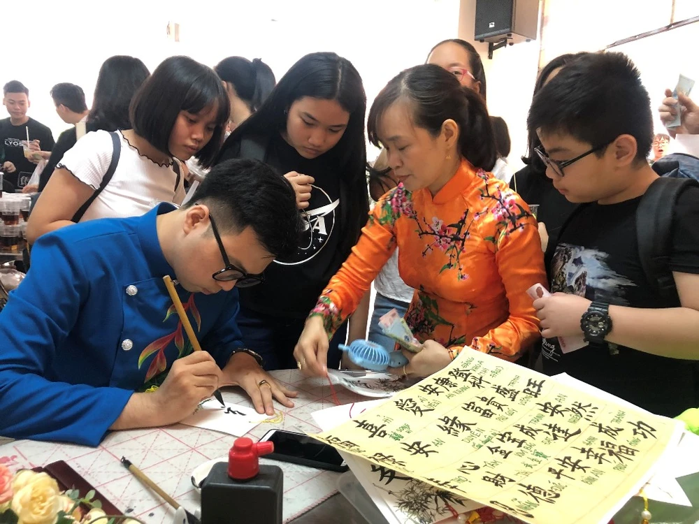 Gian hàng viết chữ thư pháp của thầy Võ Kim Bảo thu hút nhiều học sinh. Ảnh: PN