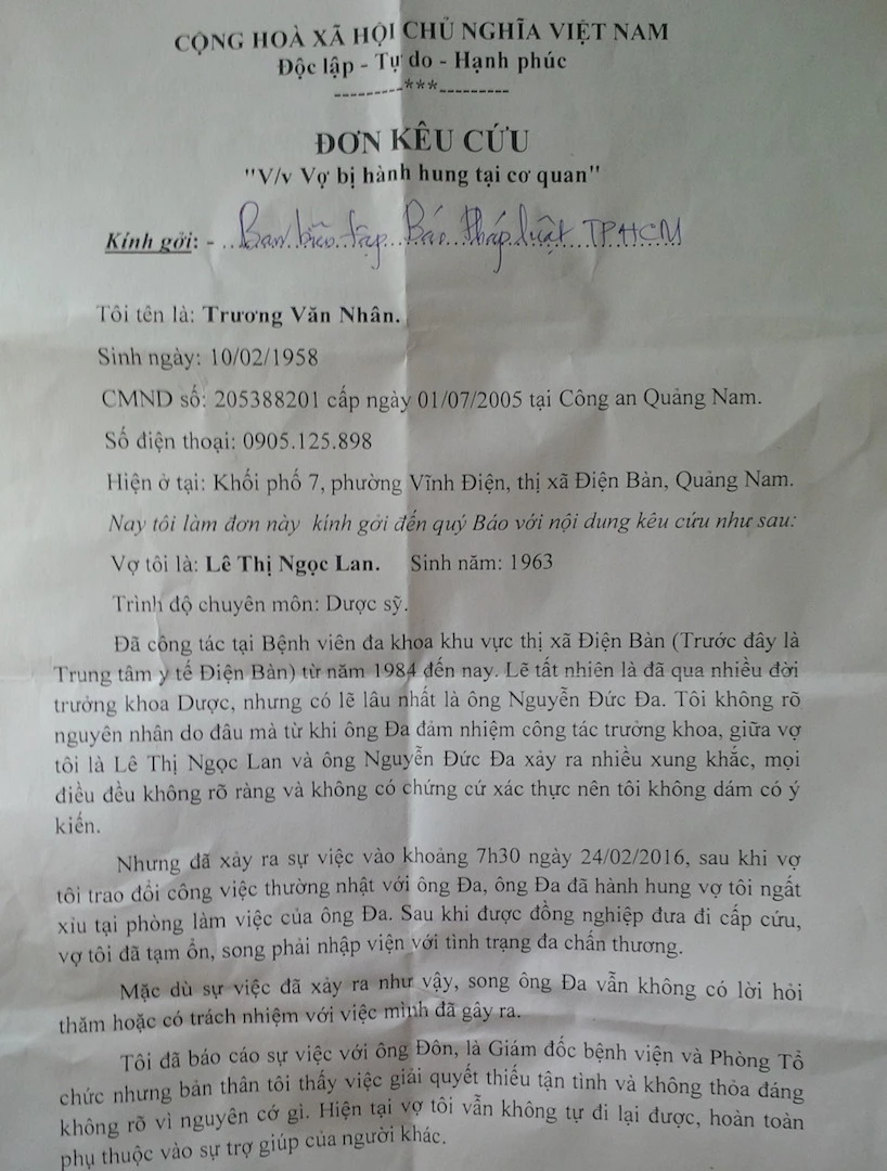 Ông Trương Văn Nhân (chồng bà Lan) đang chăm sóc vợ trong bệnh viện cho biết thêm chỉ sau khi ông gửi đơn lên Công an phường Vĩnh Điện (thị xã Điện Bàn) yêu cầu xử lý thì ông Đa mới vào hỏi thăm qua loa rồi đi.