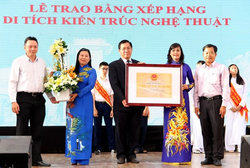 Ông Phạm Thành Nam - Trưởng phòng Di sản Sở VH-TT TP và ông Trương Kim Quân - Giám đốc Trung tâm bảo tồn di tích Sở VH-TT TP.HCM trao bằng xếp hạng Di tích Kiến trúc Nghệ thuật cấp TP cho Trường THPT chuyên Lê Hồng Phong chiều 20-11. Ảnh: HOÀNG GIANG