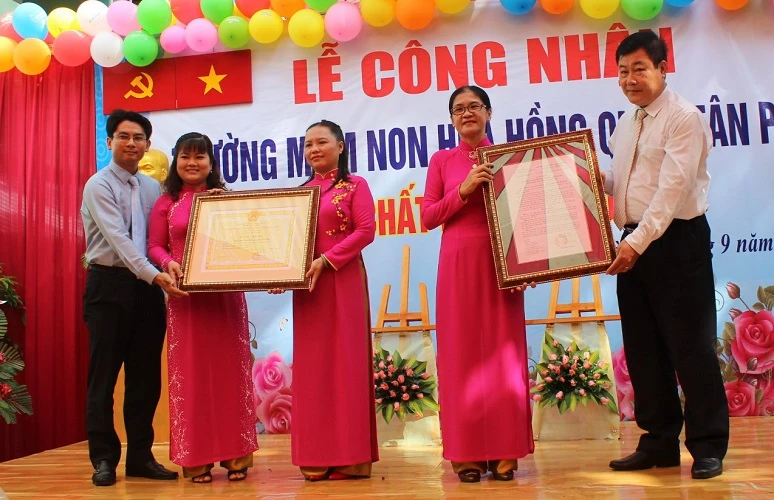Ông Trần Văn Phúc, Phó chủ tịch UBND quận Tân Phú và ông Dương Thành Tài, chuyên viên phòng Khảo thí và Kiểm định chất lượng giáo dục (trái) trao bằng khen và quyết định công nhận chất lượng giáo dục cho trường Mầm non Hoa Hồng. Ảnh: H.LAN