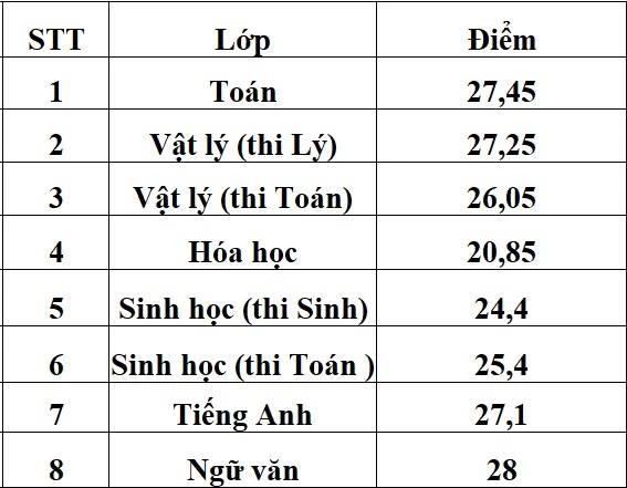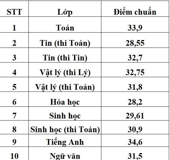 Theo đó, lớp chuyên tiếng Anh có điểm chuẩn cao nhất là 34,6 (cơ sở 1), tiếp đến là lớp chuyên Toán: 33,9 điểm (cơ sở 1).