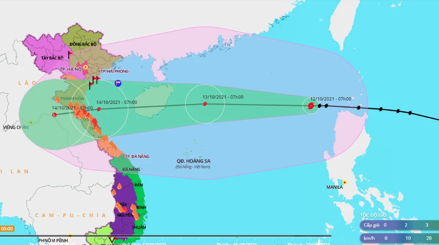 Trung tâm Dự báo khí tượng thuỷ văn quốc gia cho biết, hồi 7 giờ sáng nay, 12-10, vị trí tâm bão ở khoảng 18,9 độ Vĩ Bắc; 119,0 độ Kinh Đông, cách quần đảo Hoàng Sa khoảng 850 km về phía Đông Đông Bắc. Sức gió mạnh nhất vùng gần tâm bão mạnh cấp 10-11 (90-120 km/giờ), giật cấp 13. Bán kính gió mạnh từ cấp 6, giật từ cấp 8 trở lên khoảng 220 km tính từ tâm bão.