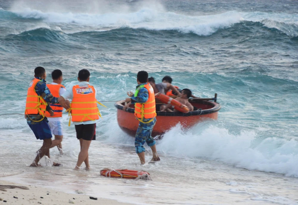 Lực lượng đảo Song Tử Tây cấp cứu ngư dân bị nạn. Ảnh: ĐÀO PHƯƠNG CHI