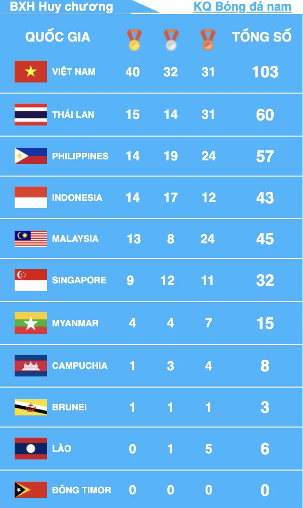 Tính đến 14h30 hôm nay (15-5), theo thống kê từ BTC SEA Games 31, đoàn Việt Nam tiếp tục dẫn đầu tuyệt đối trên bảng tổng sắp huy chương với 40 HCV, 32 HCB và 31 HCĐ, hơn đoàn xếp sau là Thái Lan đến 25 HCV (Thái Lan giành 15 HCV, 14 HCB, 31 HCĐ). Đến lúc này, Đông Timor là đoàn duy nhất chưa giành được huy chương SEA Games 31 nào.