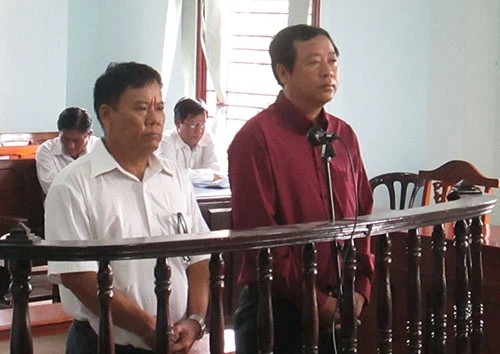 Bị cáo Kiệt (bên trái) và bị cáo Minh trong phần thẩm vấn tại phiên tòa ngày 17-4. Ảnh: N.Nam