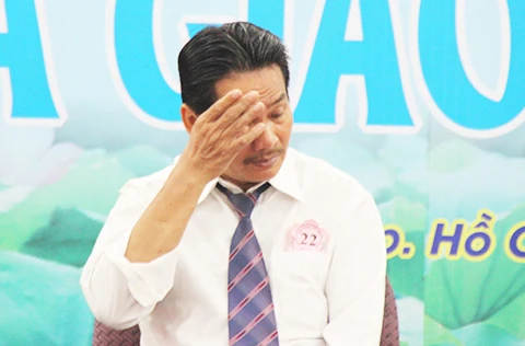 Thầy giáo Trần Văn Long (Trường Tiểu học Hoàng Văn Thụ, Tân Bình, TP.HCM) đã rơi nước mắt khi chia sẻ những câu chuyện xúc động về tình thầy trò tại buổi giao lưu do Sở GD-ĐT TP.HCM tổ chức ngày 19/11. Ảnh: baomoi