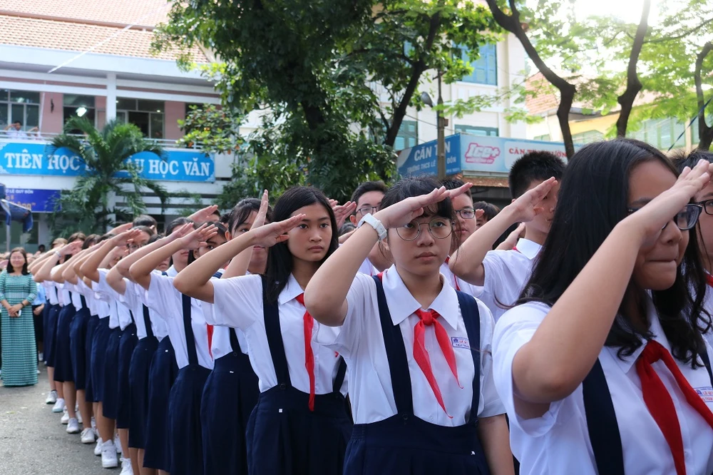 Học sinh nghiêm trang làm lễ chào cờ. Ảnh: THANH TUYỀN
