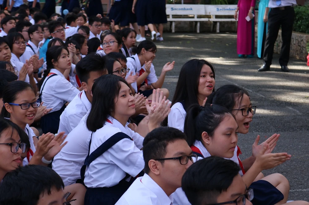 Các anh chị khối lớp 9 chào đón các em ở lớp 6. Ảnh: THANH TUYỀN