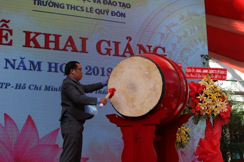 TS Phạm Đăng Khoa đánh ba hồi trống báo hiệu năm học mới 2018-2019 chính thức bắt đầu. Ảnh: THANH TUYỀN