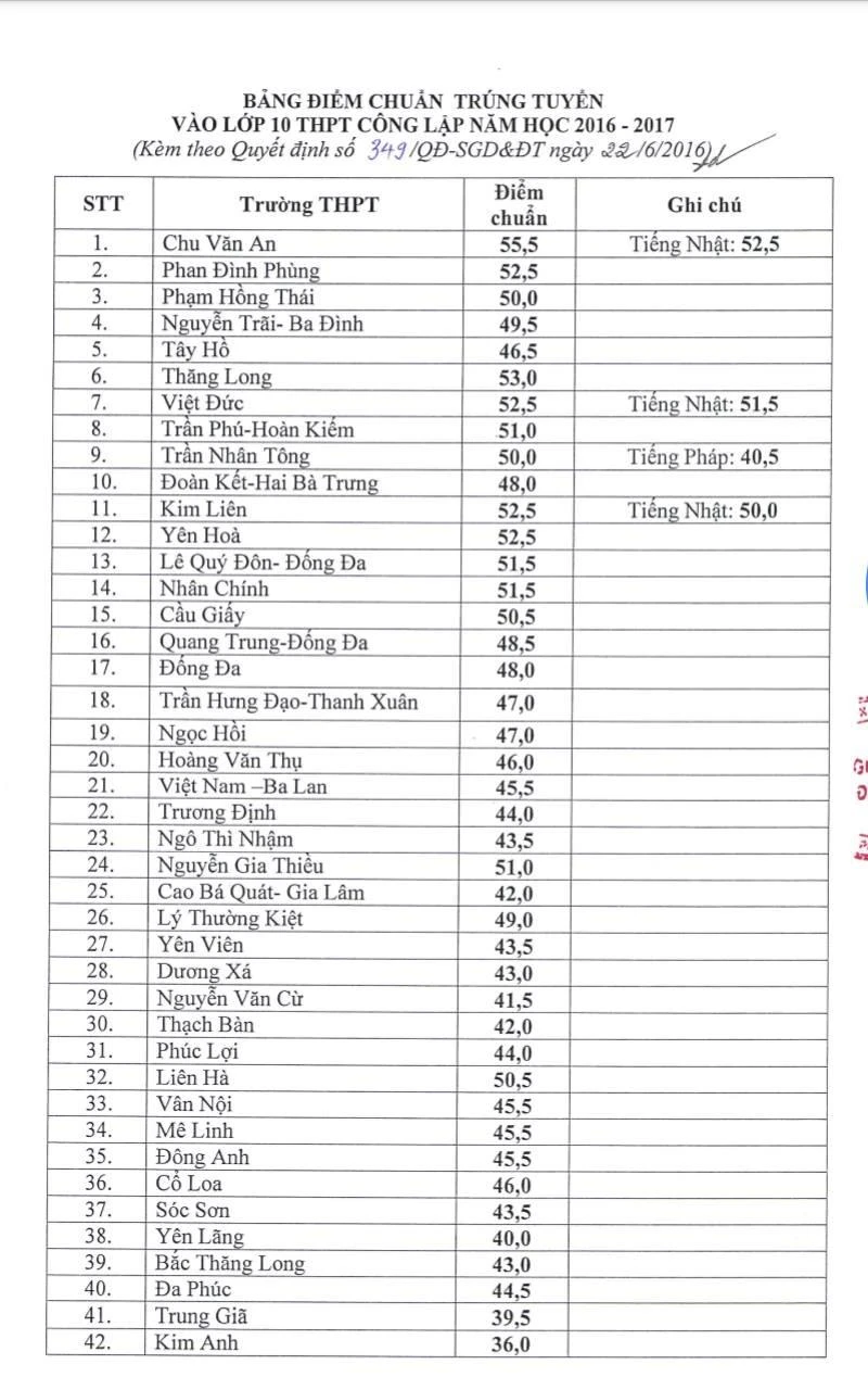 Bảng điểm chuẩn đầu vào của các trường THPT công lập Hà Nội năm nay.