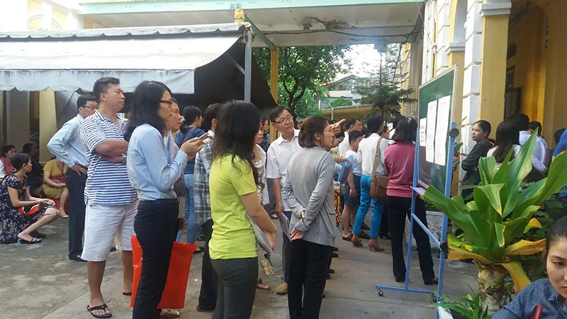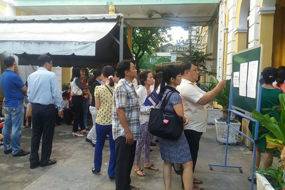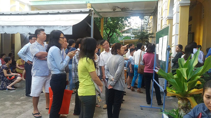 Phụ huynh đến sớm để nộp hồ sơ cho con.
