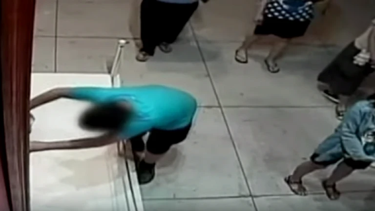 Cậu bé vô tình trượt ngã, vịn tay vào bức tranh và để lại một lỗ hỏng nhỏ trên bức tranh (nguồn: Youtube)