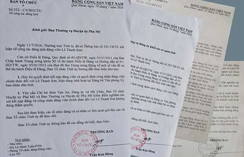 “Ban Tổ chức Tỉnh ủy Bình Định đã có văn bản yêu cầu Ban Thường vụ Đảng ủy khối các cơ quan tỉnh xóa tên khỏi danh sách đảng viên đối với ông Lê Thanh Sơn, Phó phòng Văn xã Văn phòng UBND tỉnh này. Đồng thời, yêu cầu Ban Thường vụ Huyện ủy Phù Mỹ hủy bỏ quyết định kết nạp đảng viên, quyết định công nhận đảng viên chính thức đối với ông Sơn” - ngày 3-8, ông Trần Kim Hùng, Trưởng ban Tổ chức Tỉnh ủy Bình Định, thông tin.