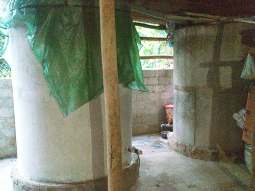 Ông Đào Quang Thọ bên bể chứa nước bị kẻ xấu đổ thuốc trừ sâu vào để đầu độc cả đám cưới.