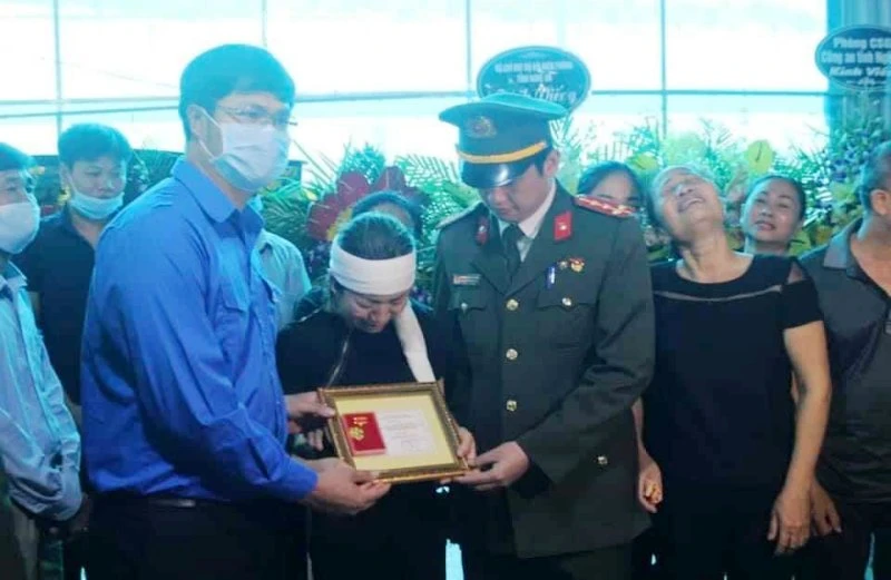 Chiều 24-3, Công an tỉnh Nghệ An đã tổ chức trọng thể lễ truy điệu Đại úy Sầm Quốc Nghĩa (29 tuổi, cán bộ Công an huyện miền núi Quế Phong, Nghệ An) hy sinh trong khi làm nhiệm vụ vây bắt nhóm đối tượng mua bán ma túy.