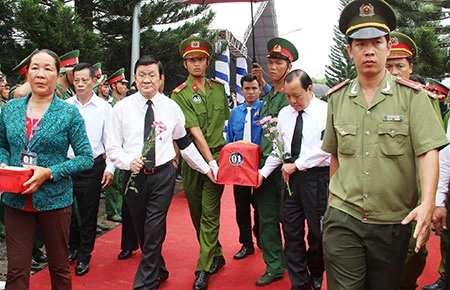 Chủ tịch nước Trương Tấn Sang cùng Bí thư Thành ủy TP.HCM Lê Thanh Hải đưa di cốt liệt sĩ tới nơi an táng. Ảnh: VĂN NGỌC
