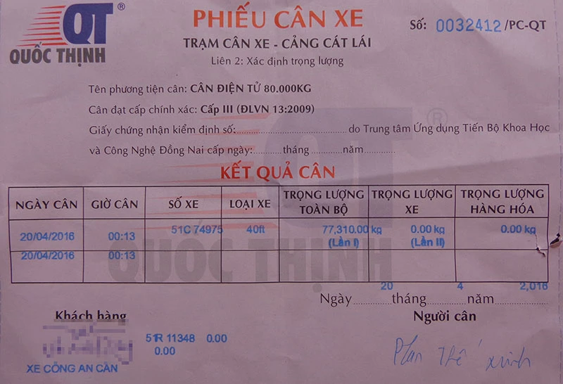 Sau kiểm tra giấy tờ, Thanh tra GTVT đội 5 đưa xe vào trạm cân gần nhất để cân kiểm tra chính xác, khách quan tải trọng thực xe đang chở. Kết quả từ phiếu cân cho thấy nhiều xe chỉ cho phép chở 36-40 tấn nhưng thực tế chở quá tải đến 77 tấn.