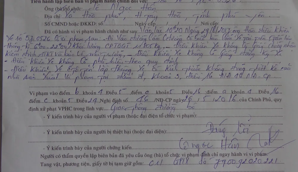 Qua kiểm tra, Thanh tra giao thông đội số 1 còn phát hiện xe không có giấy đăng kiểm, không phù hiệu.... Qua tra cứu dữ liệu đănng kiểm trên mạng bằng smart phone Thanh tra giao thông phát hiện chiếc xe 57L -0256 này đã hết hạn đăng kiểm theo chu kỳ từ hơn 8 tháng qua.