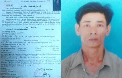 Cơ quan CSĐT Công an tỉnh Bà Rịa-Vũng Tàu đã ra quyết định truy nã đối với bị can Lê Thanh Thao (47 tuổi, giám đốc DNTN Toàn Thắng, xã Hắc Dịch, huyện Tân Thành) về tội lừa đảo chiếm đoạt tài sản.