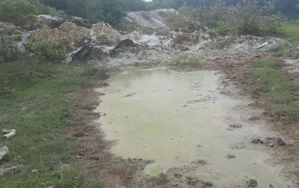 Theo chỉ dẫn, chúng tôi đến khu vực hầm đất nằm cạnh suối Phước Bình thì phát hiện khu đất đã được san bằng nhưng phía trên mặt đất là những hòn đá màu vàng xanh nằm vương vãi khắp nơi, một hố nước đặc quánh xanh lè ở cạnh đó. Khi đi vào khu đất này, mùi hăng hắc bốc lên làm chúng tôi ngộp thở.