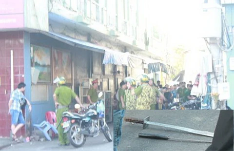 Hàng chục cảnh sát phong tỏa khu vực xảy ra truy sát. Hai con dao dài nghi của nhóm gây án bỏ lại hiện trường. Ảnh: VA