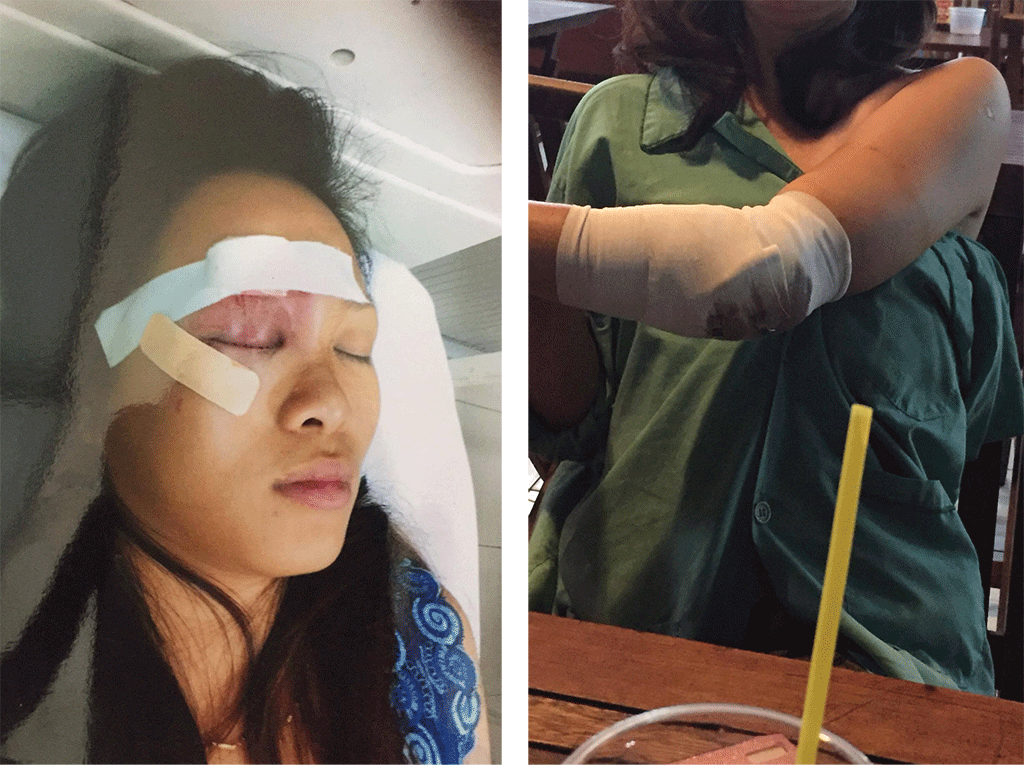 Vết thương của chị Tuyết (bên trái) và vết thương ở tay bà Thủy do nhóm thanh niên gây ra.