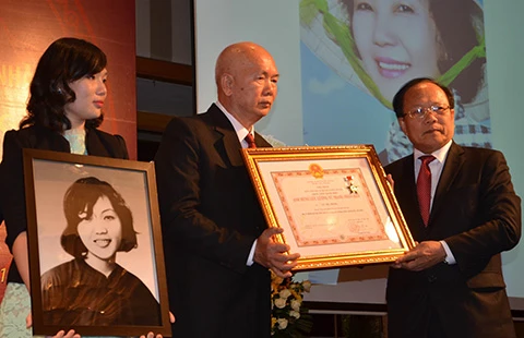 Bộ trưởng Hoàng Tuấn Anh thừa ủy nhiệm của Chủ tịch nước trao danh hiệu Anh hùng Lực lượng vũ trang nhân dân cho thân nhân bà Võ Thị Thắng. Ảnh: TÁ LÂM