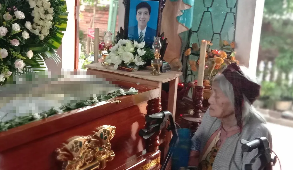 Bà nội ngồi bên di ảnh, linh cữu cháu và nói "vì sao Nhã mất?", mọi người trả lời: "Cháu Nhã cứu người trên biển". Ảnh: ĐL