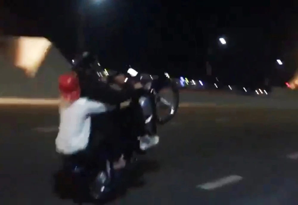 Hai thanh niên ngồi cùng xe máy bốc đầu ở Đà Nẵng.