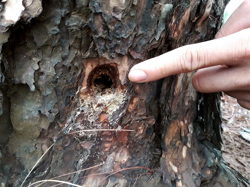 Gốc thông bị khoan lổ để đổ hóa chất vào.
